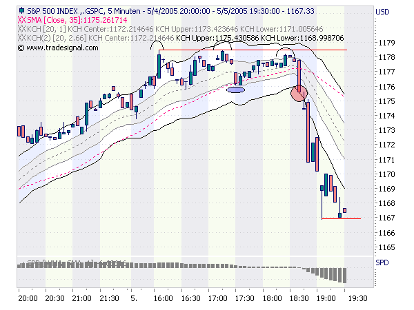 Das ist ausreichend aufgebaute bärische Dynamik, unterstützt durch die abwärts weisende SPD [was für ein Omen!] vor dem Signal. (Man hätte ganz mutig auch schon in der Flagge den Ausbruch handeln können!)