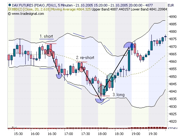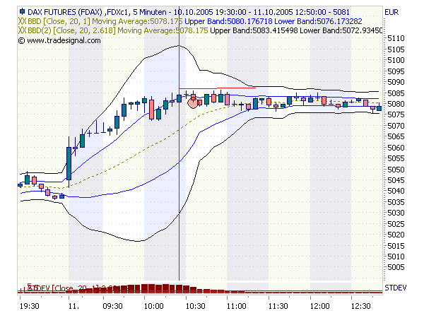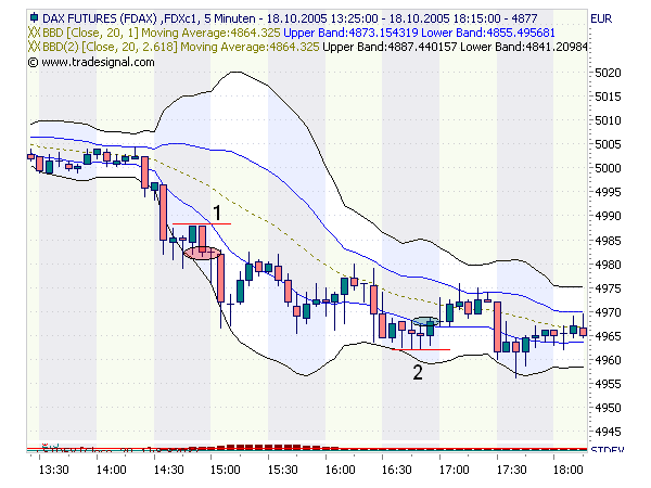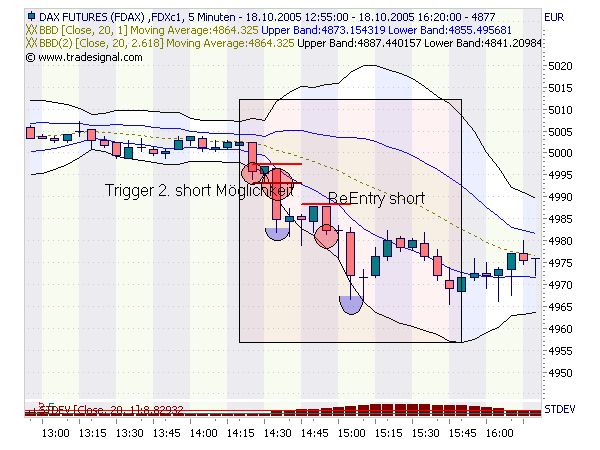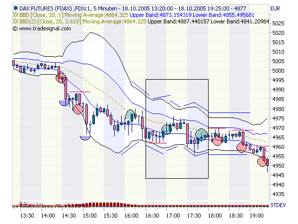 Was ich in den letzten Postings vorgestellt habe als 5min-Handelsansatz beruht auch nicht in erster Linie auf Widerständen/Unterstützungen sondern auf der Anwendung der Bollinger Bänder.