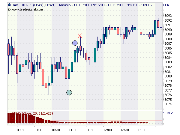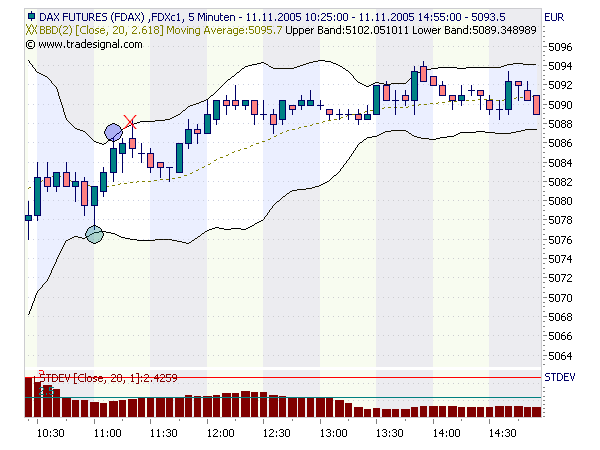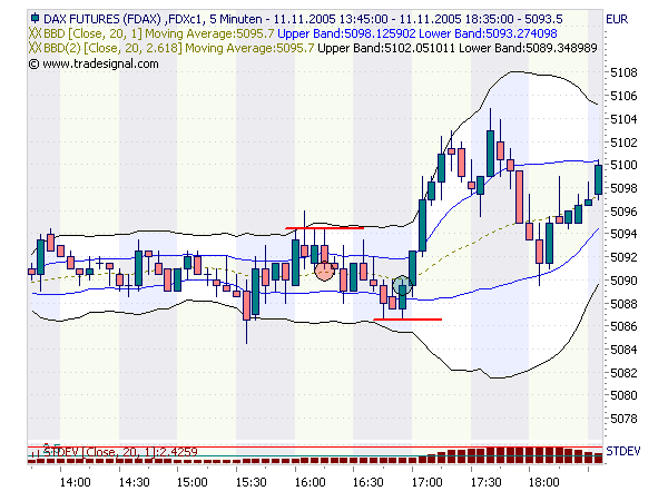 Es gibt aber für Trendbewegungen (wohlgemerkt in 5min, da kann ein Trend auch mal nach 20 Min vorbei sein, oder nach 10 Min versanden) ein Exit, bei dem spätestens rausgegangen wird, nämlich bei einem Close im inneren BBD (das ist ein Band mit Stdv 1).