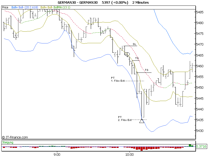 Anbei mal ein Chartbeispiel vom Freitag zur Illustration: das war vom Entry bis Exit eine 30 P Bewegung in knapp 12 Minuten bei einem IS von 4 P + 1 + 2 Spread = 7 P.