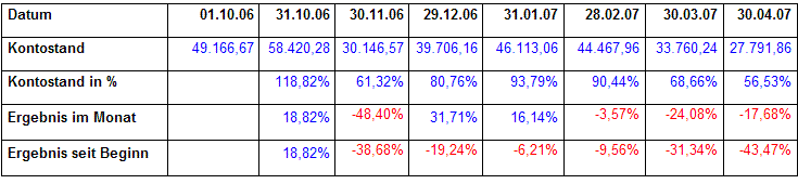 Um den Grund ihrer Entscheidungen zu verdeutlichen wurde die Entwicklung eines Musterdepots ab 1.10.2006 mitgeschickt. (siehe Anhang)
