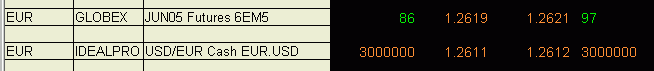 Wed May 18 09:44:38 2005 EST - The EUR futures (6E) trading on Globex have