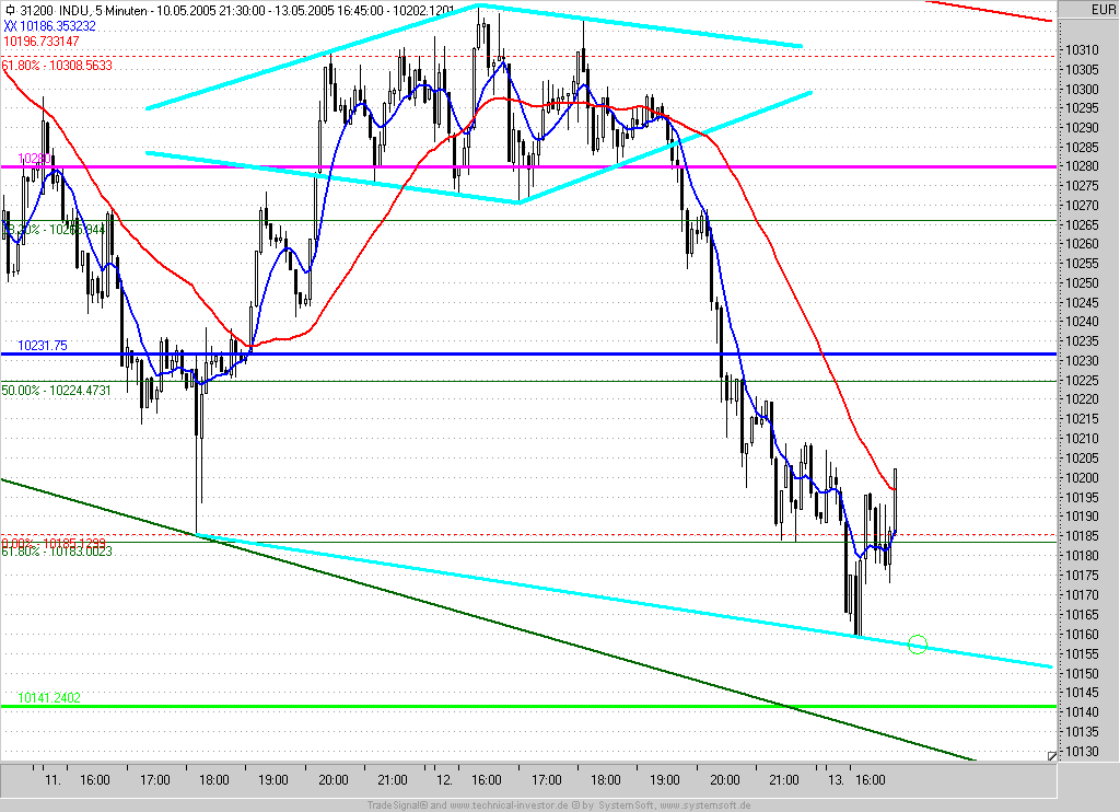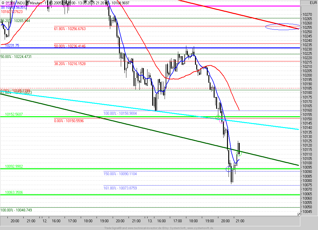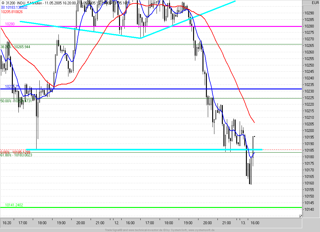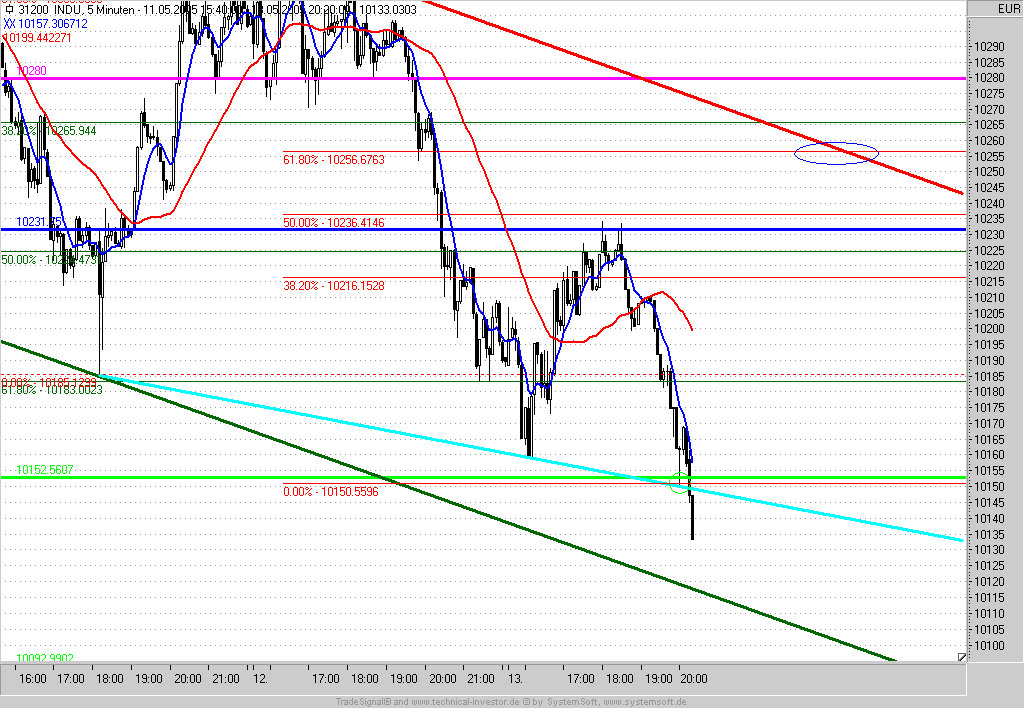 Mindestens ein 5min-Close. An Pivot kann man ja den Durchbruch oder den Abprall handeln. Mein Shortsignal ist nach dem Doppeltop am Pivot und anschließendem 5min-Close unter dem blauen MA generiert worden (10220). Kursziel 10185 als 35P.