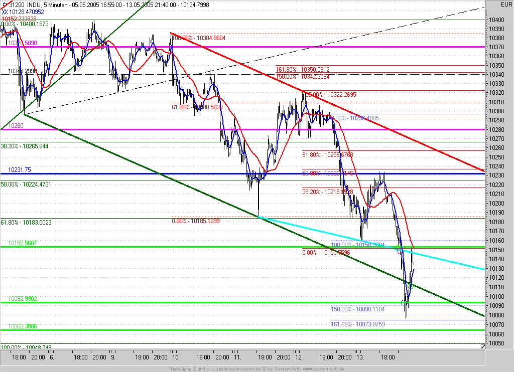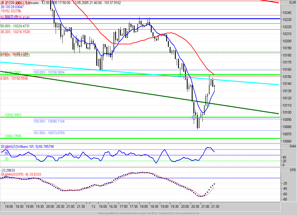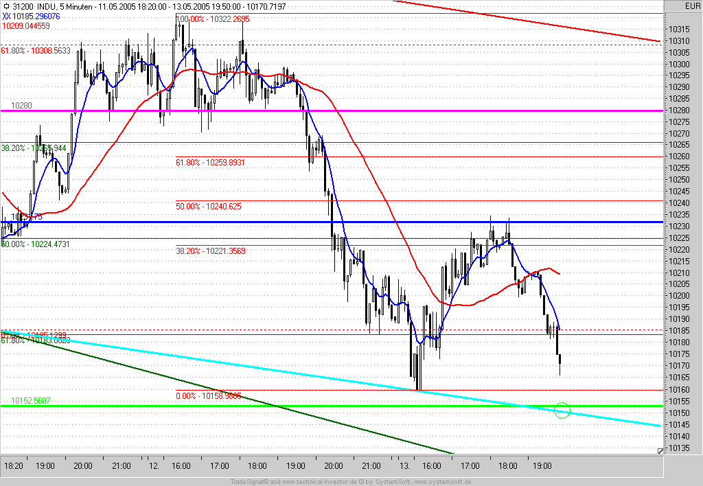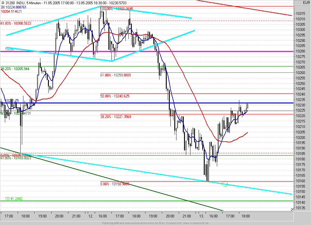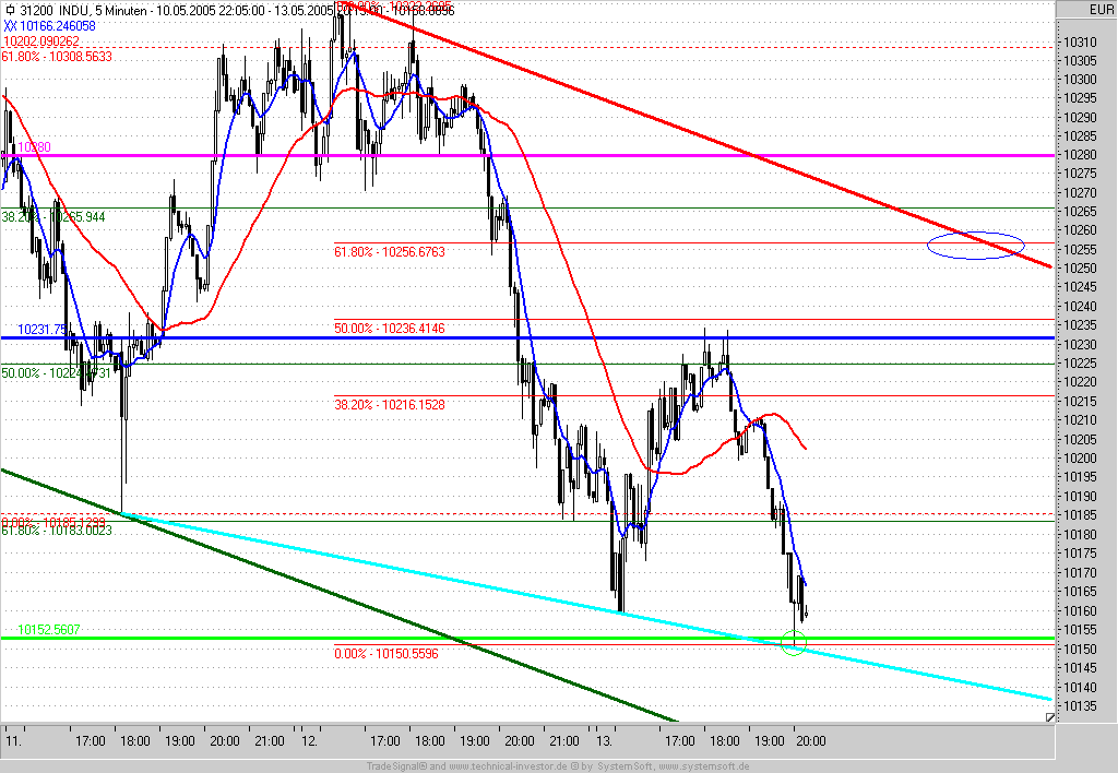 Mindestens ein 5min-Close. An Pivot kann man ja den Durchbruch oder den Abprall handeln. Mein Shortsignal ist nach dem Doppeltop am Pivot und anschließendem 5min-Close unter dem blauen MA generiert worden (10220). Kursziel 10185 als 35P.