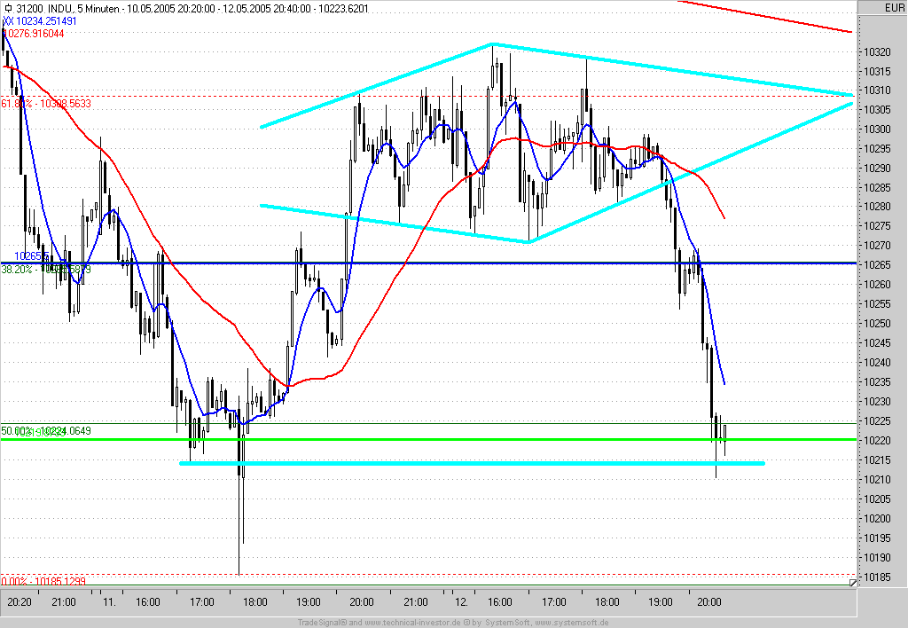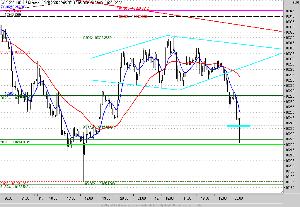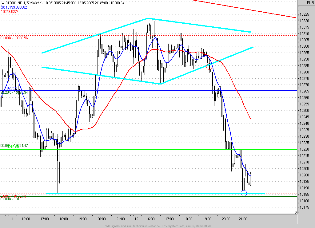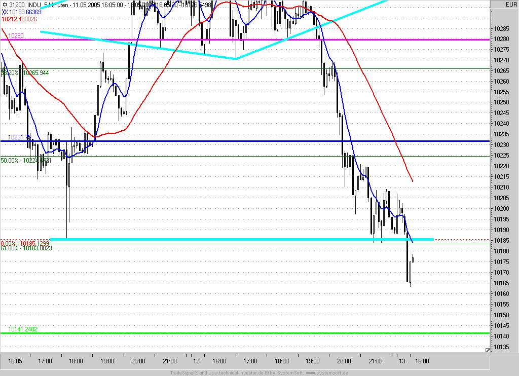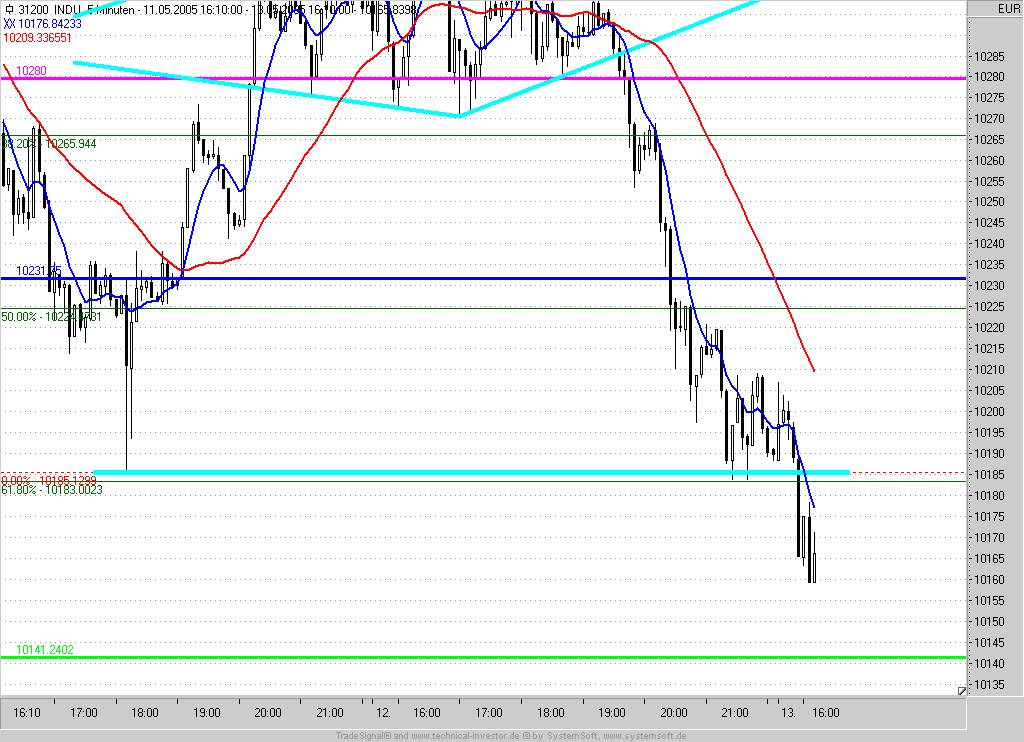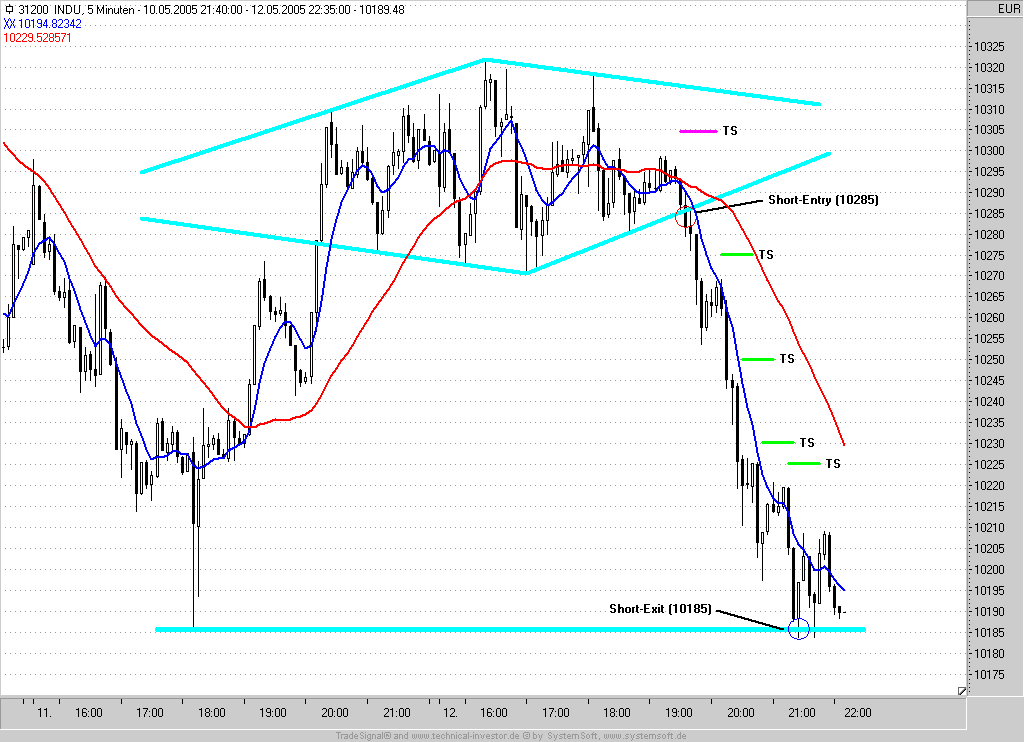 Short-Entry bei Rücklauf an den Ausbruch (10285) mit IS auf der 10305 = letztes Zwischenhoch +5P und Profit-Target bei 10185.