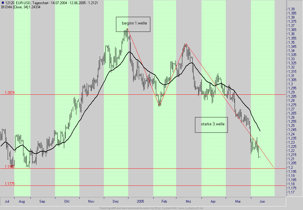 ist die Trendlinie durchbrochen, ist eine neue Welle entstanden - die Waver geben dann der Welle einen Unterbuchstaben (Teil der großen Welle)