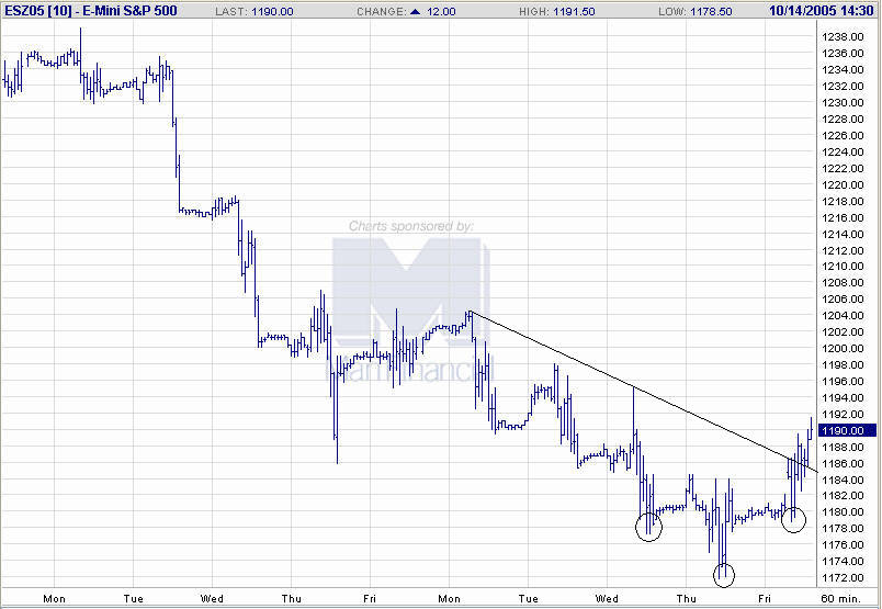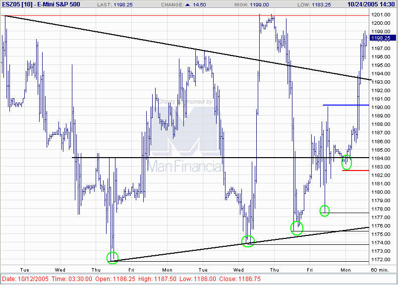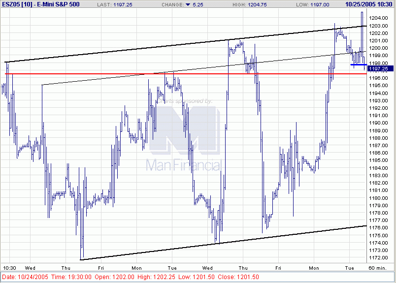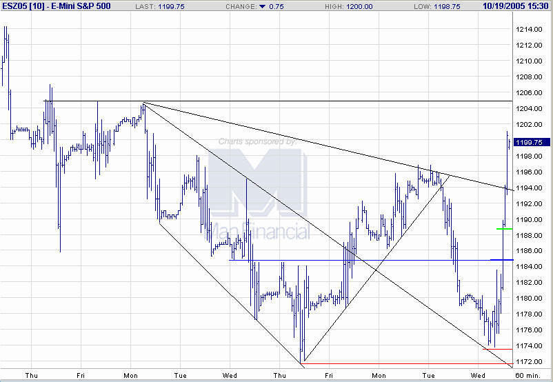 Die eingegangene Long-Position (ESZ05) befindet sich derzeit 10,0P im Gewinn, was aktuell ca. einer einfachen ATR(3) entspricht. Der Trailing-Stop wird daher aktiviert und auf 1185,75 nachgezogen, damit bei einem möglichen Rückfall wenigstens nach Abzug der Gebühren ein "kleiner" Gewinn verbleibt.