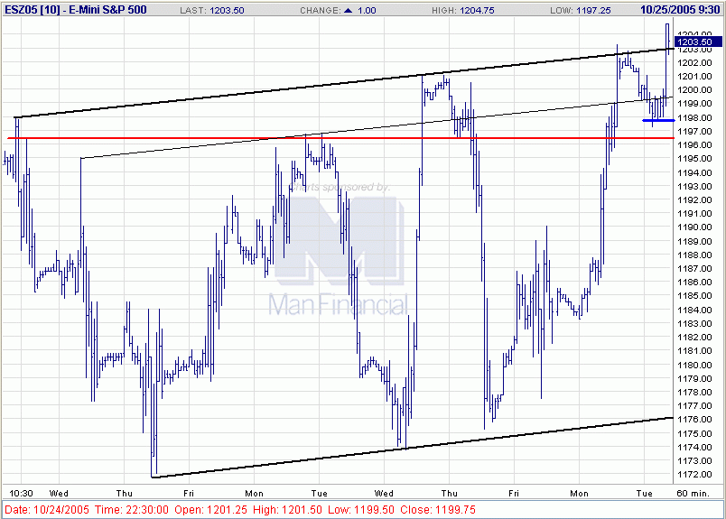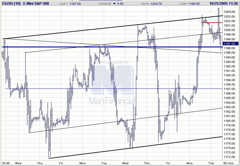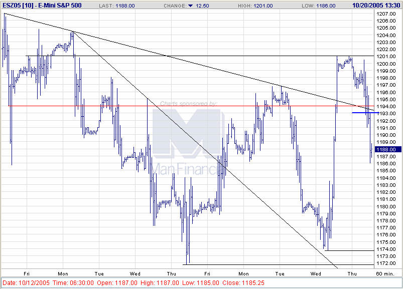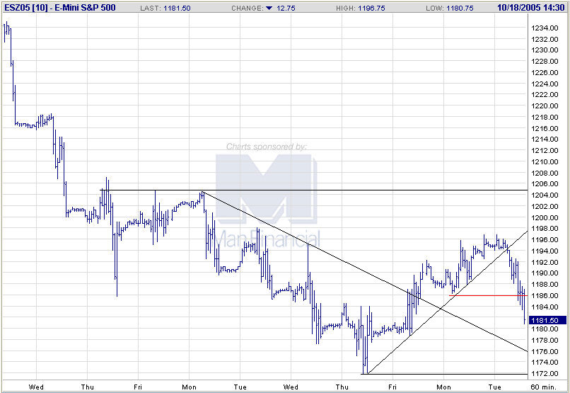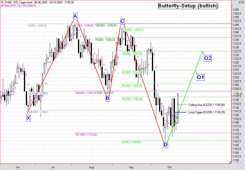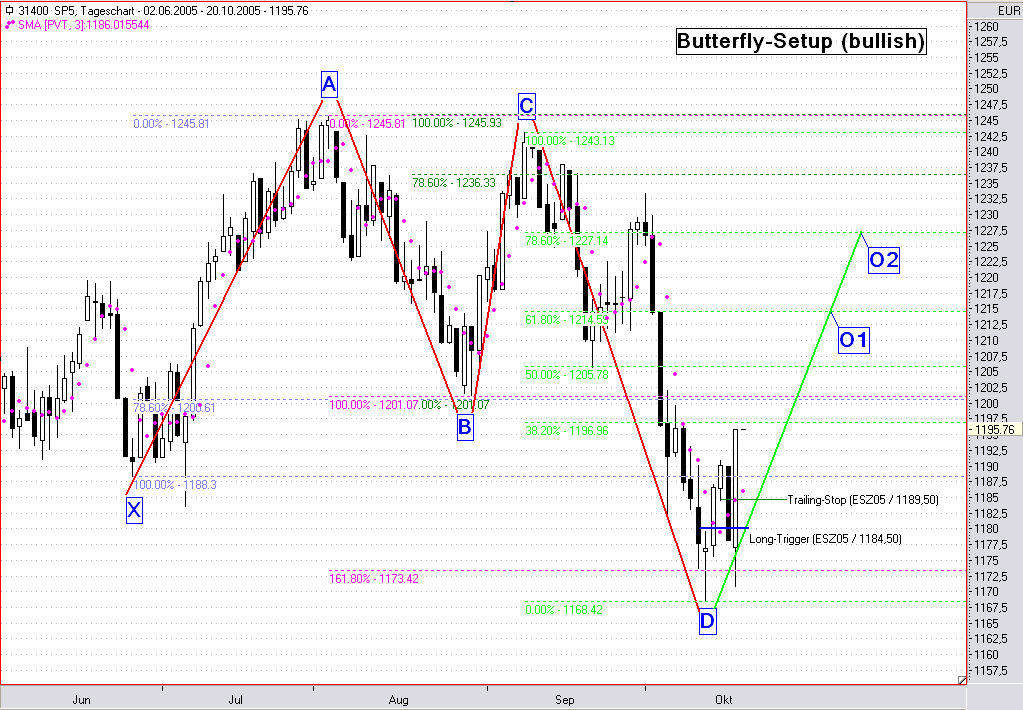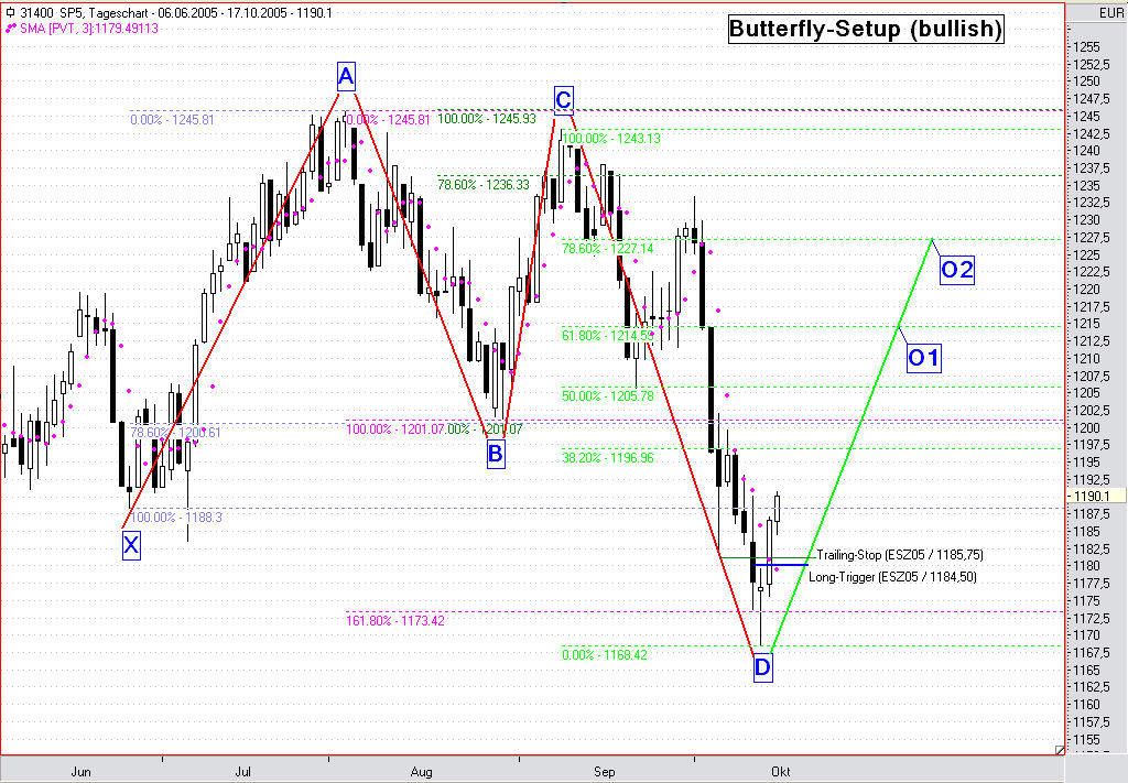 Im heutigen Handelsverlauf wurde der Trailing-Stop bei 1185,75 (ESZ05) getriggert. Es verbleibt somit ein kleiner Gewinn von 1,25 Punkten, oder 125,00 USD vor Gebühren. Der weitere Kursverlauf muss nun erst mal abgewartet werden. Derzeit sieht jedoch alles sehr bärisch aus, da bei dem gestarteten Retracement nicht einmal die Mindestkorrektur bis zur 38,2%-Marke erreicht werden konnte.
