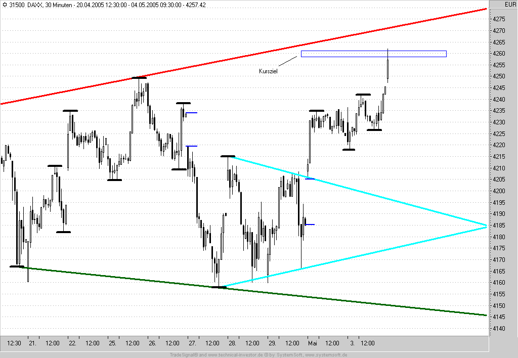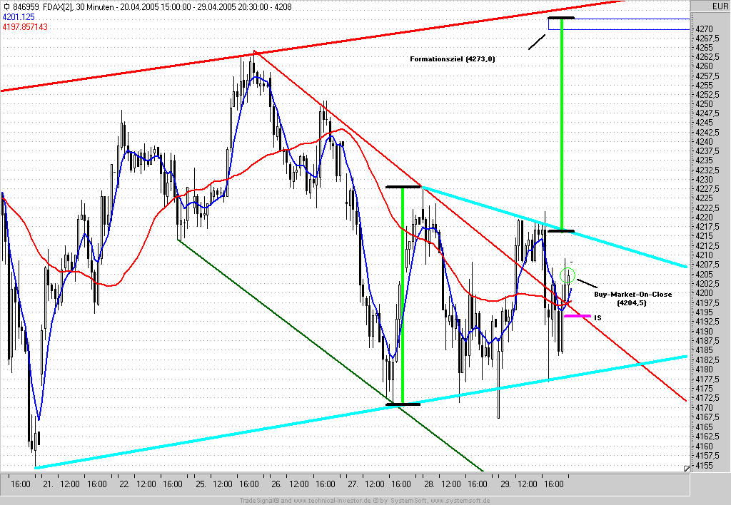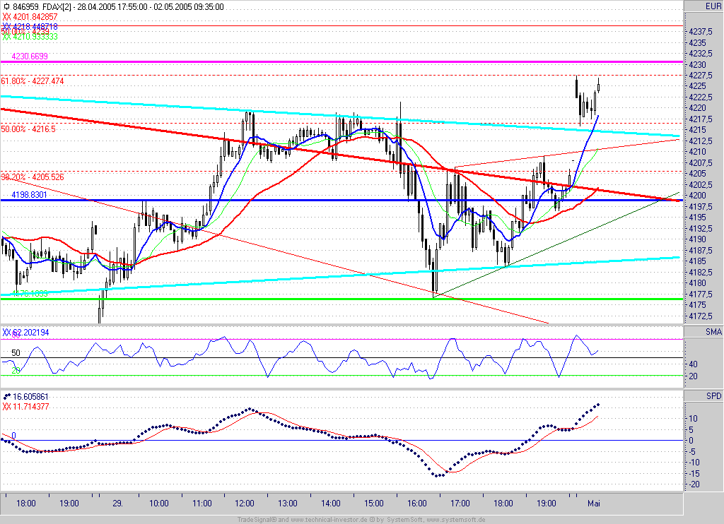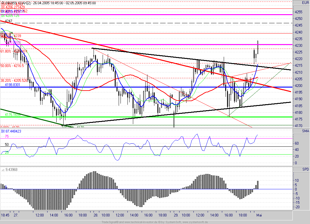 Ein kleiner Hinweis: bei d4f wurde der Dax um 22 UHr zu 4210 geschlossen (und das ist als Umrechnung der US Indizes ziemlich verläßlich); aber auch der Wert wäre ja, wenn auch etwas knapper über der 'eingebetteten' oberen Dreieckskante.