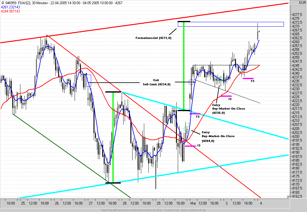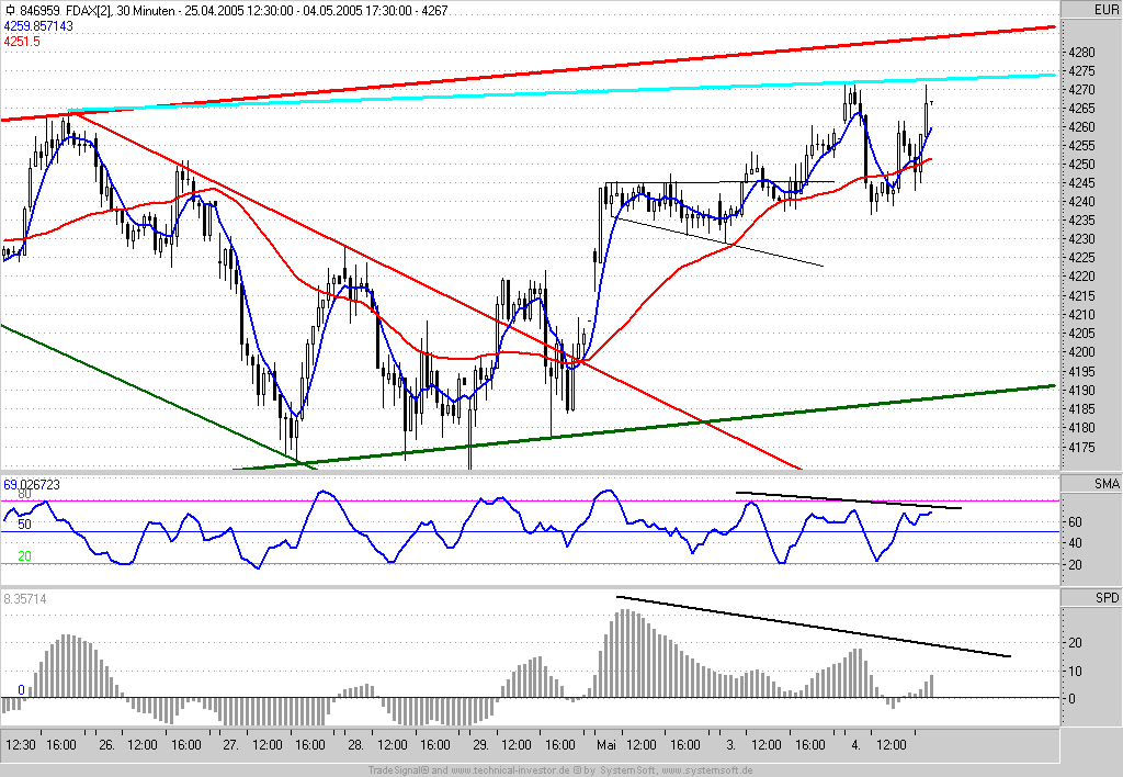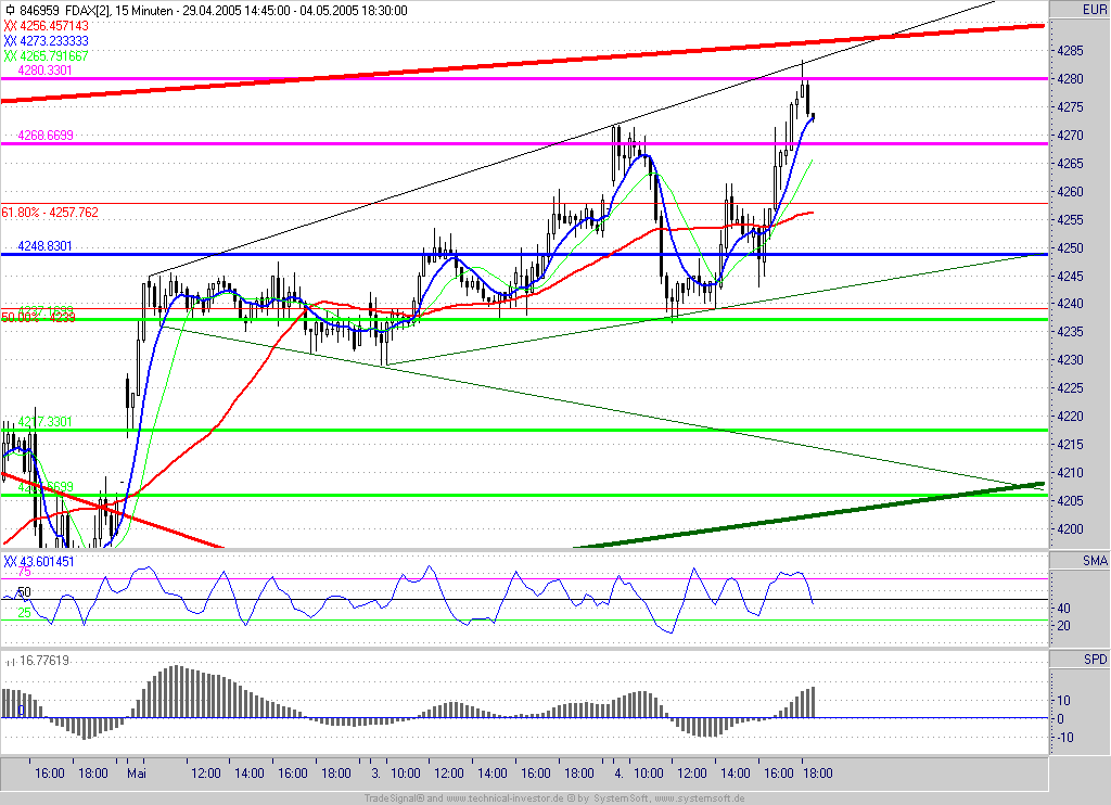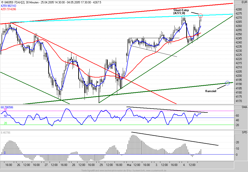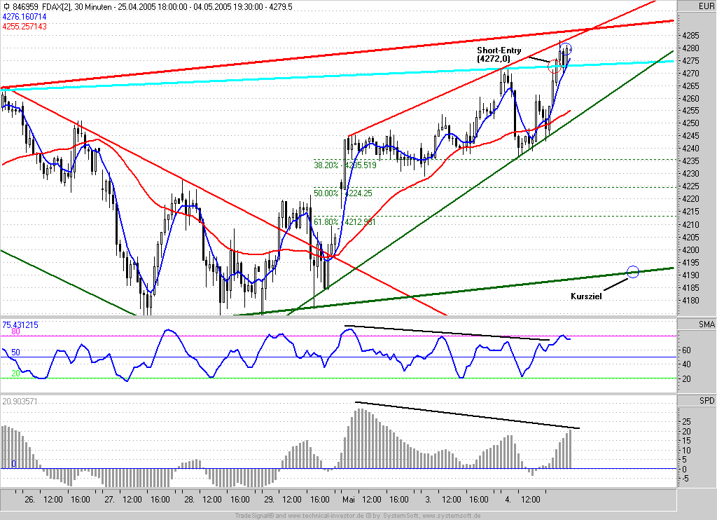 Wie bereits schön öfters vorgestellt. Antizyklisch Short bei nochmaligem Erreichen der hellblauen Linie mit IS auf 4288,0 oder bei Schlusskurs mit bullischer Candle über dieser Linie. Das Profitziel liegt am unteren Schenkel des Aufwärtstrends.