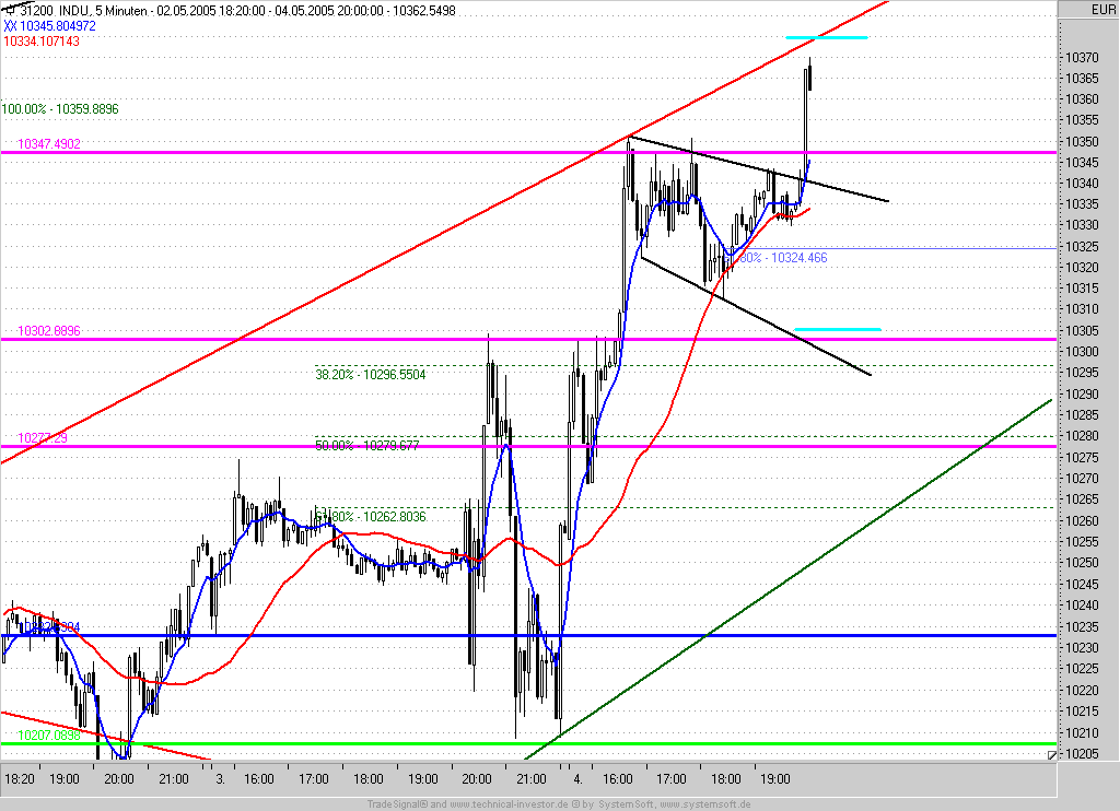 Der DJIA befindet sich derzeit in einer bullischen Konsolidierungsformation. Für ein besseres CRV wäre es "wünschenswert" wenn der Index bis ca. 10325 weiter konsolidieren würde. Hier würde ein Einstieg mit 20P-SL erfolgen. Das Profitziel läge dann bei ca. 10375. Ein vorzeitiger Ausbruch würden bullischen Charakter noch verstärken.