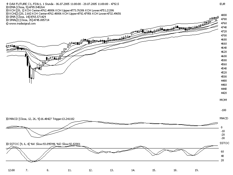 seit der letzten beschreibung hat sich grundsätzlich nichts geändert. ich versuche einen trend zu reiten. wenn es längere zeit in eine richtung geht wie derzeit dann klappt das natürlich sehr gut. statt die ganze zeit long zu bleiben verkaufe ich an potentiellen übertreibungspunkten (oberer KCH2) und kaufe an unteren punkten (oberer KCH1 bei so einem steilen trend oder unterer KCH1 bei langsam steigendem trend) zurück.