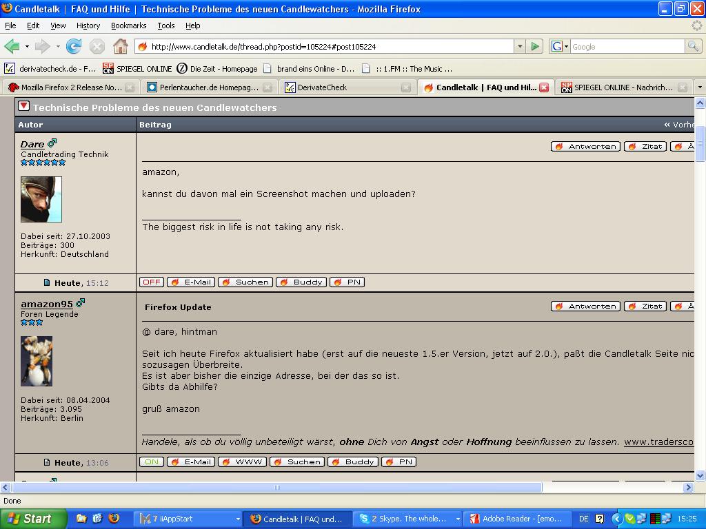 Nachdem ich gestern morgen neustarte, war das Problem wieder da. Candeltalk paßte nicht ins Browserfenster. Die veränderten Einstellungen waren aber erhalten geblieben. Irgendwann am Nachmittag bei einer Aktualisierung der Candletalk Seite paßte es plötzlich wieder.