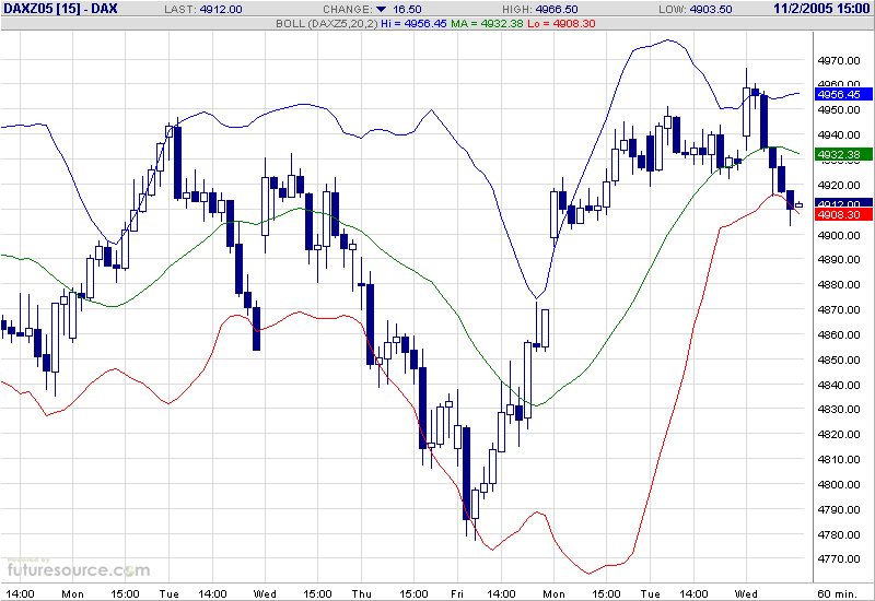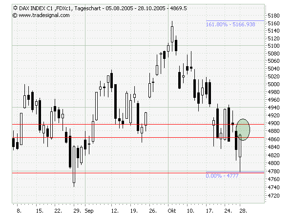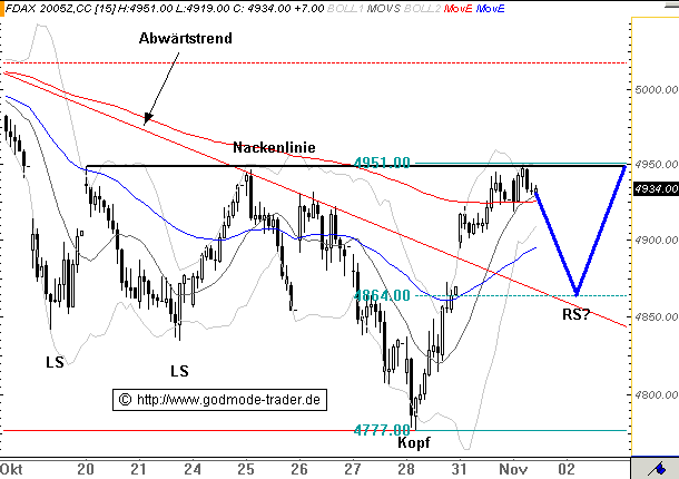 Bin mir inzwischen nicht sicher, ob ich den Stop nicht falsch gewählt habe. Einerseits möchte ich nicht bei einer durchaus möglichen und unkritischen Gegenbewegung am Tief rausfliegen, andererseits muß ich zusehen, daß mir nicht schon wieder Punkte unnötig verloren gehen. Da ich einfach aus psychologischen Gründen einen Teilerfolg brauche, setze ich den Stop auf 4973. Damit müßte ein erneuter Test der 5000 im FDAX abgedeckt sein.