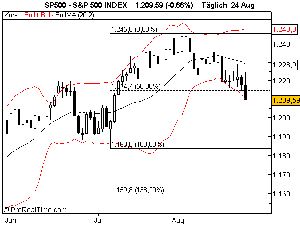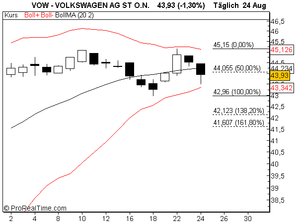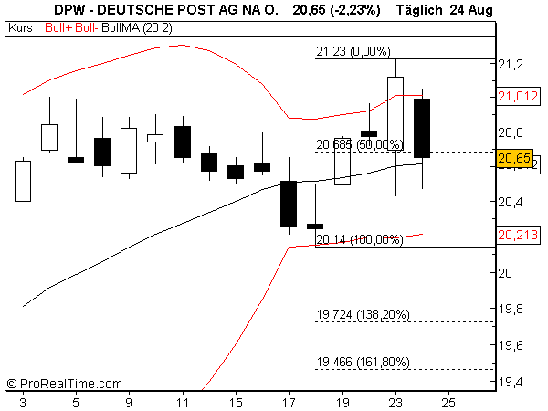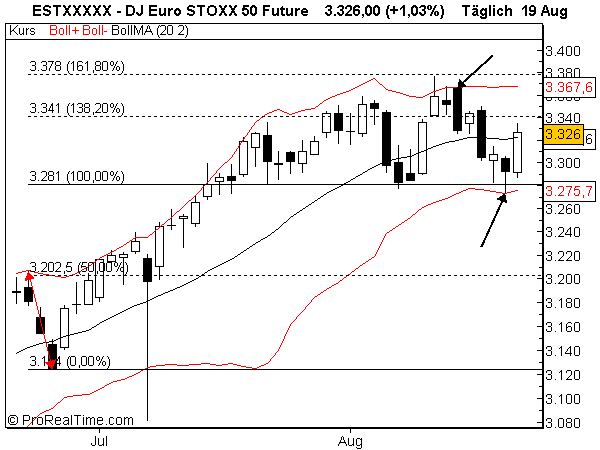 Long legged doji, könnte zu einem evening star werden. Close aber über Augusthoch, positiv. BBD zwar noch aufgebogen (Ausbruch), Kerzen mahnen zur Vorsicht, widersprüchliche Signallage.