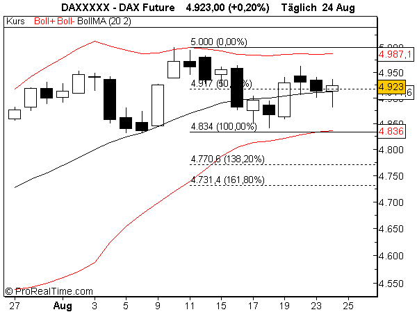 Schon das zweite doji an der 5000, diesmal sogar inside day. Lange schwarze Kerze für Evening star hätte heute kommen müssen. Werte ich positiv. BBD beginnen sich zu öffnen, Kurs an BBD+, keine short Indikation. US Indizes wollten nicht so richtig runter. Da alle Optionen noch offen sind: