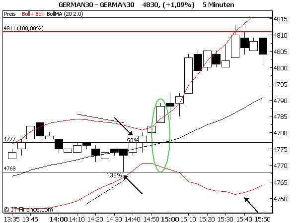 BBD+ und BBD- sind eingedreht, Korrekturziel BBD- (chart 1) oder BBDMA (chart 2). Fiboziele am BBD-/BBDMA eigenen sich als long Einstieg/ Ausstieg short. Chart 2 zeigt schön den Wechsel des Fibos von Widerstand zu Unterstützung. Die Kerze kurz vor 14 Uhr erreicht BBD+, Korrekturziel des vorherigen breakouts, bricht aber ein wichtiges Fibo, das so zur Unterstützung wird.