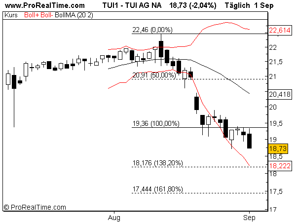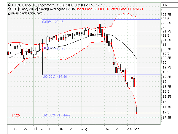 ja, DIESER Teil des Ausbruchs, was ja nicht gleich long heißt. Ich freue mich immer wieder, wie präzise Deine Beobachtungen und Formulierungen sind. Auch Nison verstehe ich so, daß Umkehrsignale nicht den Wechsel von z.B. short nach long sondern short - seitwärts bedeuten. Ich wollte damit auch nicht sagen, daß es nicht weiter runtergehen kann oder wird, wer weiß das schon. Vielleicht hat mich einfach heute Morgen die Faszination gepackt, daß am 11.08. schon zu sehen war, wo TUI - Bezugsrechte am 02.09. landen könnte. Vielleicht mangelt es mir momentan auch ein wenig an Ernsthaftigkeit bei den postings, fand es einfach interessant und mal wieder einen Hinweis, daß sich BBD und Fibos ganz gut vertragen. Sind derzeit sehr viele Eindrücke, die ich hier einfach mal poste und leider noch nicht zu einem nachvollziehbaren Ganzen zusammenführen konnte. Fingerübungen trifft es wohl am besten.
