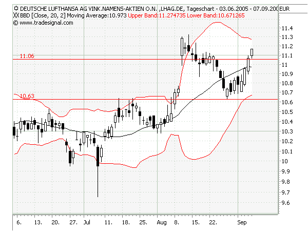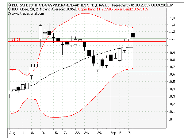 Lufthansa: wichtige übergeordnete 50% gebrochen, erfolgreicher Test untergeordnete 50%. BBD ziehen sich zusammen, Tendenz seitwärts. Breakout möglich, zumindest Test BBD+ und 11,33.