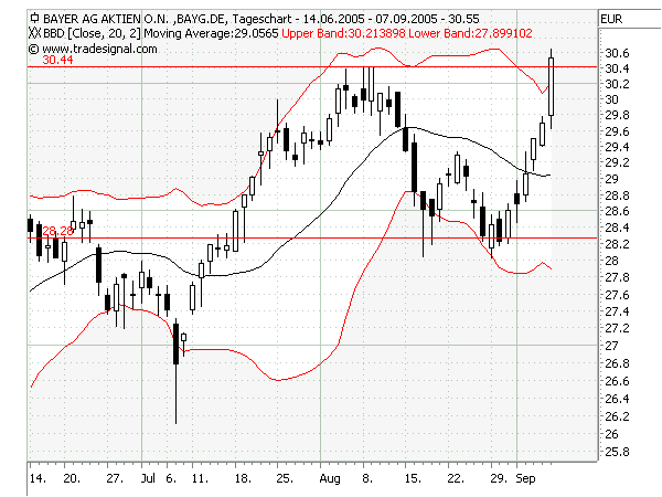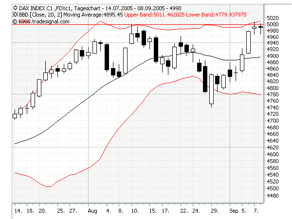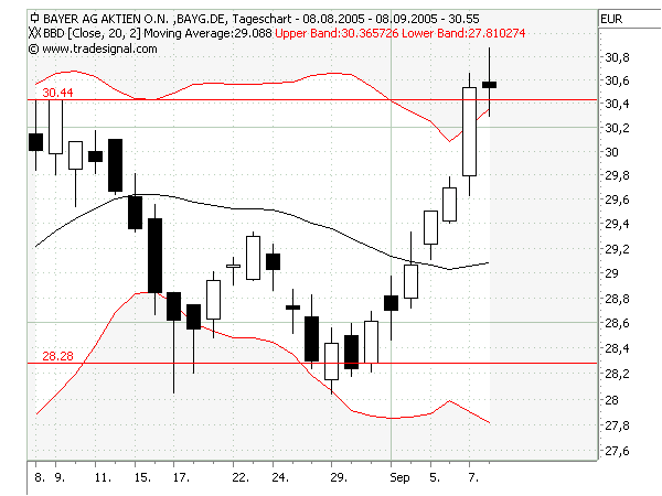 Einfach zu beobachten: egal ob es einen Ausbruch nach oben oder unten gibt, die Bänder gehen jeweils auf die gleiche Art auf.