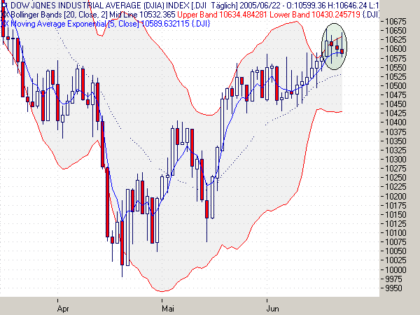 Das obere Bollinger Band hat eingedreht, die Preisänderungen der letzten Tage weichen also weniger stark von ihrem Mittel ab als noch am 13.06. Die Stärke des Aufwärtstrends hat abgenommen. Ich meine, der obere Schatten der Freitagskerze mit Schluß um 4604 bestätigt dies. Im FDAX sieht die Lage etwas anders aus. Da ist der Close über dem bisherigen Widerstand.