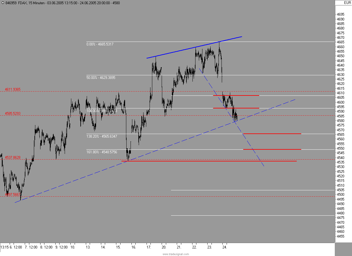 tja, als Tageskerze im DAX einen hanging man, mit low auf dem 38,2% retracement und high an dem nun schon zum 4. Mal attackierten Widerstand bei 4604. Diese range scheint sich zu manifestieren. Im FDAX ein ähnliches Bild mit einem hanging man, der gleichzeitig ein bearish harami bildet, hier allerdings im Gegensatz zu Gestern mit close unter dem Widerstand bei 4630 im Septemberkontrakt.