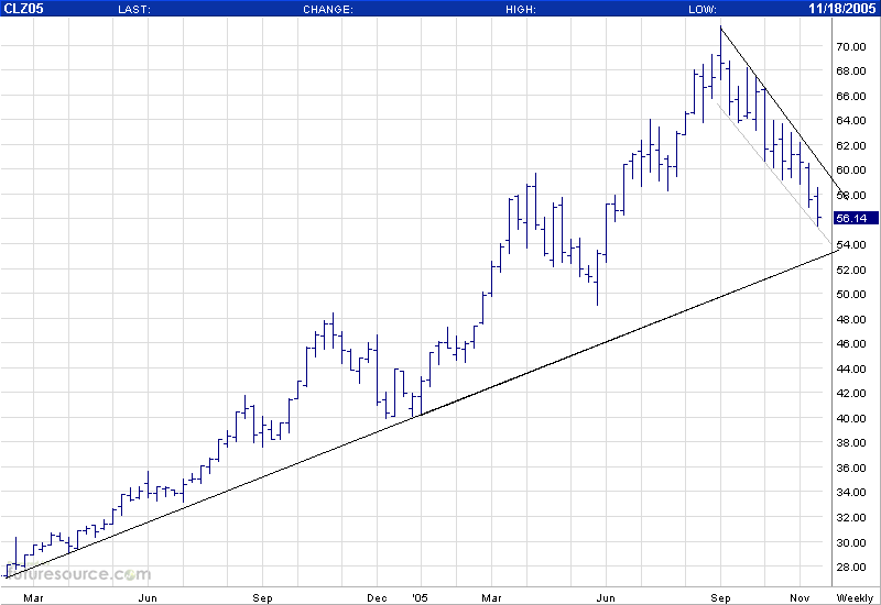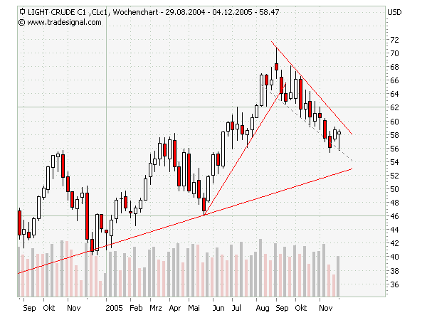 Ich verfolge Light Sweet Crude EOD, handle es aber zur Zeit noch nicht. Das Bild dort ist einigermassen parallel zu Brent denke ich. Auch dort nähern wir uns jetzt wieder dem Hauptaufwärtstrend, wärend dem sich der kleinere Abwärtstrend der seit September besteht immer mehr zuspitzt (wenn man auch die "Umkehrlinie" des Trends beachtet.)