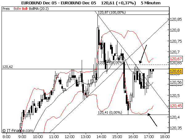 Reentry in die Abwärtsbewegung erfolgte bei Berührung der Abwärtstrendlinie und nach Bestätigung der 50% Fibo. Das BBD- nicht ideal aber auch noch nicht kontraindiziert. Spekuliert habe ich auch Ausbildung einer W-Umkehrformation, deren rechten Abwärtsschenkel ich mitnehmen wollte mit anschließendem Umkehrtrade. Am Pfeil biegt sich dann das BBD- aufwärts und die Trendlinie wird gebrochen. Hier mein exit. Kein Einstieg long wegen des sehr nahen BBD+. Ich erwartete zunächst eine Seitwärtsbewegung.