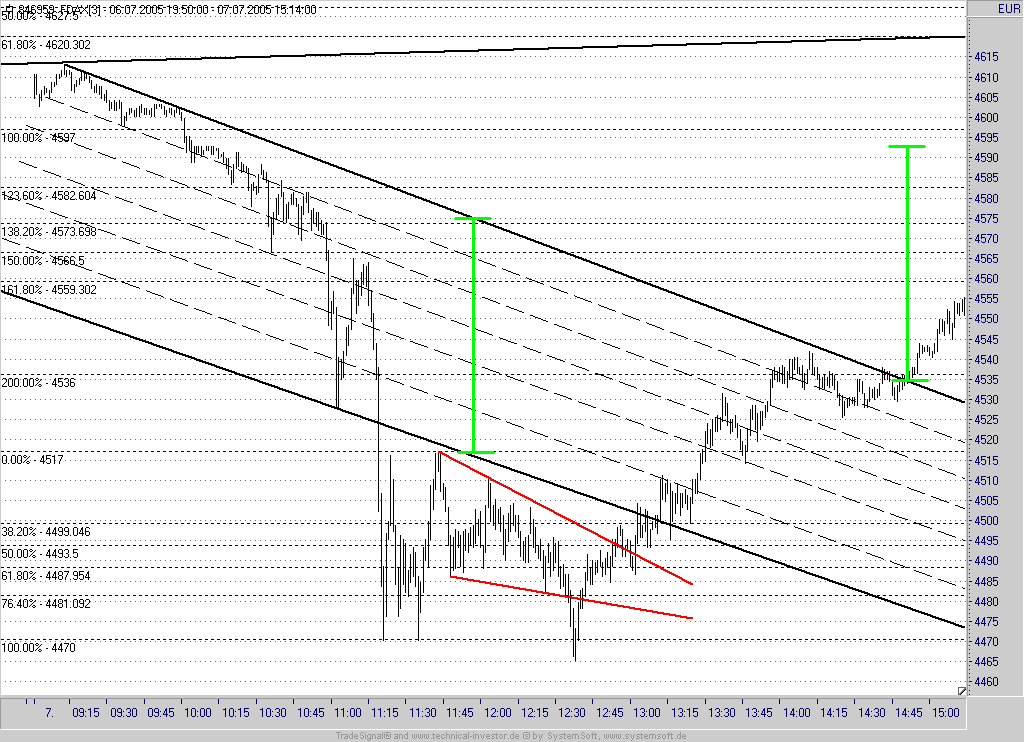 Man kann nicht nur horizentale Fibos sondern auch Parallelen mit gleichem Abstand innerhalb des Trendkanals sehr gut als Unterstützungen und Widerstände in seinen Handel mit einbeziehen, sofern sie mit Fibos zusammenfallen.