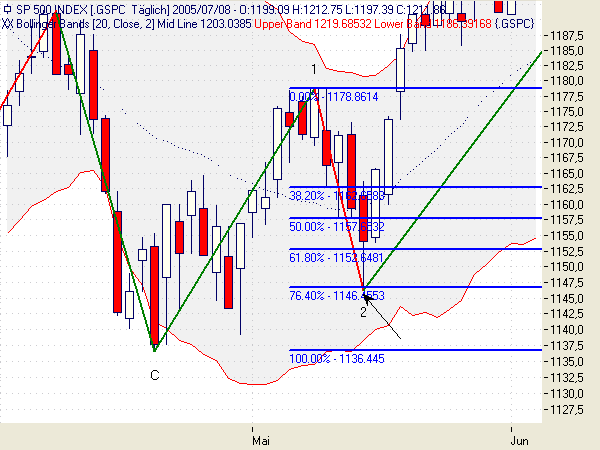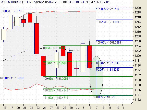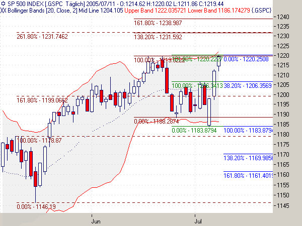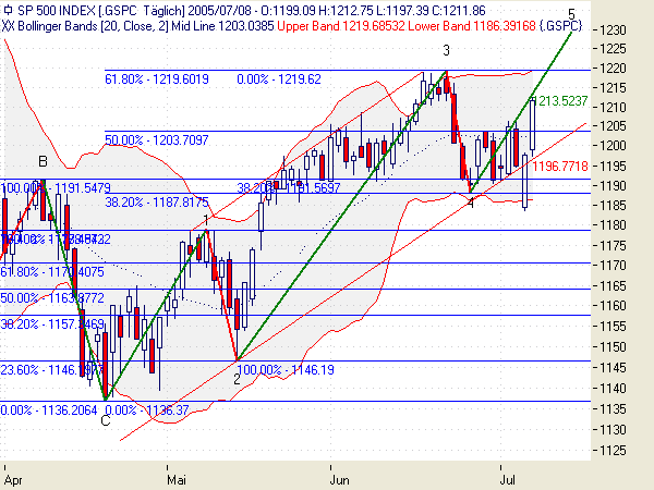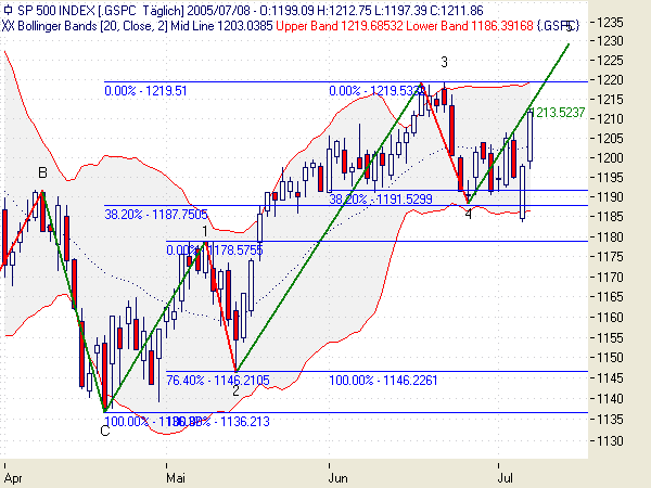 Candles: Thrusting Pattern am 07.07., der Hammer ist auf mysteriöse Art und Weise verschwunden. Aus den letzten beiden Candles könnten Three White Soldiers werden, die Kerzen sind auch noch nicht übermäßig lang, würde auch zur Wellenstruktur passen. Allerdings müßten dazu die 1219 am Montag fallen, sonst Advance Block oder sogar Stalled Pattern. Kann natürlich auch sein, daß es Montag wieder runtergeht.