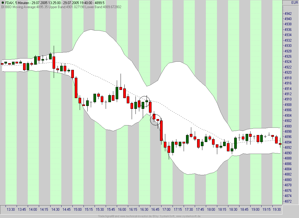 ich denke das liegt ein wenig an amazons Einstellung der Standardabweichung auf 2.618. Nach dem anfänglichen headfake 14:10 drehten die BB schon ziemlich auseinander. In der Standardeinstellung hat man sogar einen close außerhalb des Bandes, also ein bestätigtes shortsignal. Beim zweiten Signal allerdings wäre mir die Steigung des oberen BB zu flach gewesen und ich hätte den Break der 4902.5 abgewartet (wg. Fibos). Dort auch wieder close außerhalb der BB.