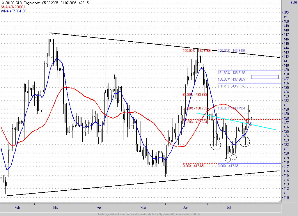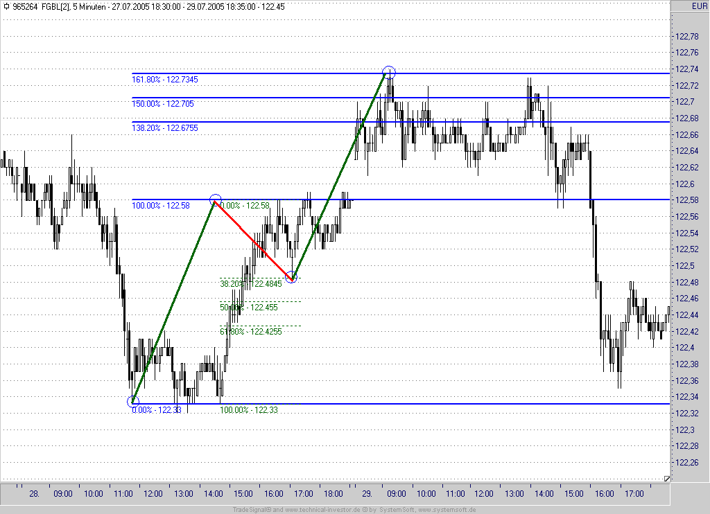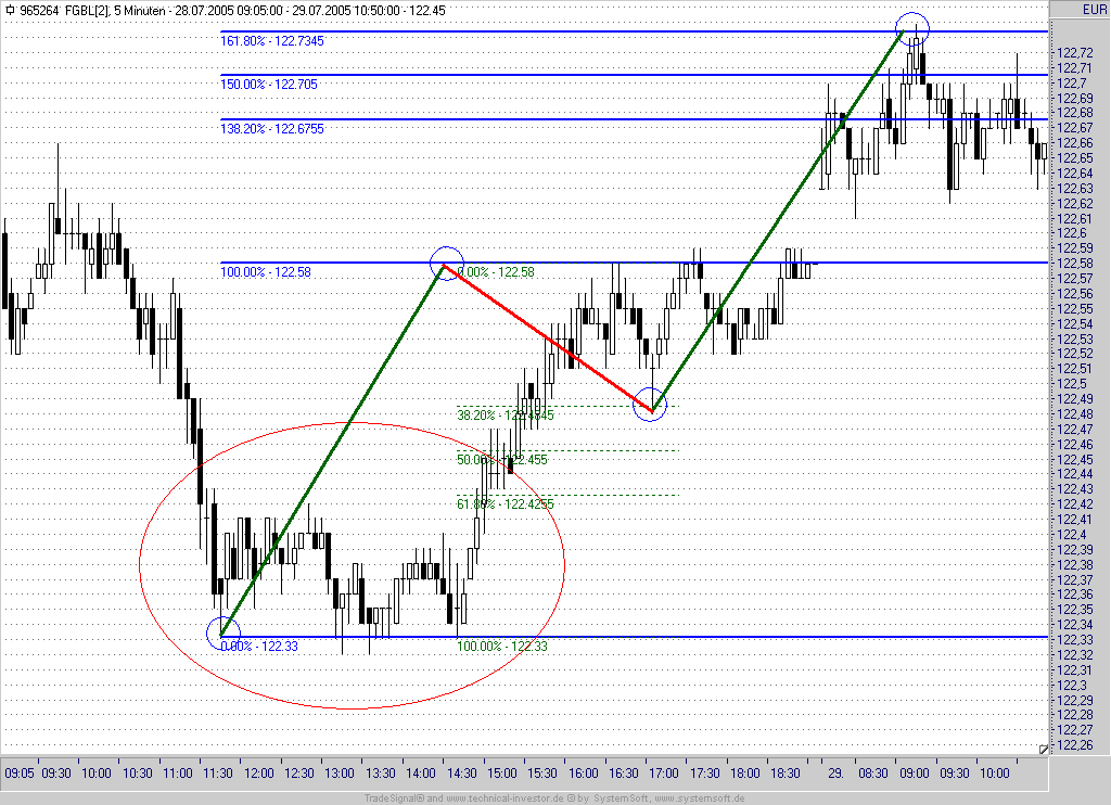 Ich hoffe, das hört sich für die wirklichen Fibo-Fachleute nicht zu blasphemisch an; aber: wenn es eine Symmetrie zwischen den einzelnen Bewegungsstrecken gibt, dann ist sie auch in jedem einzelnen Teil ersichtlich.