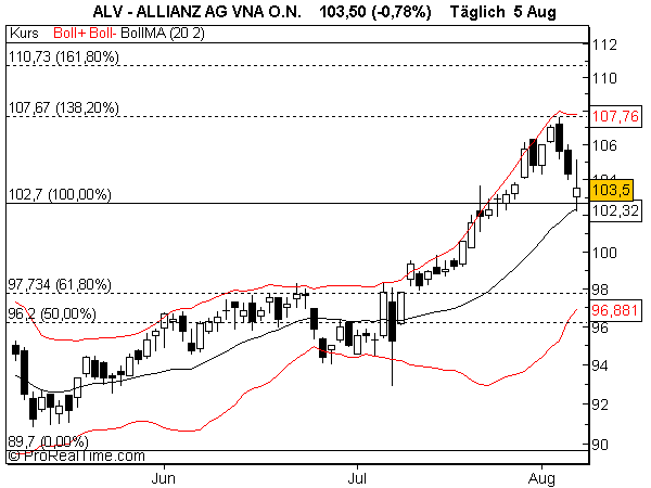 auch wenn ich das jetzt natürlich nicht beweisen kann anbei ein Allianzchart, den ich am Wochenende gemacht habe. Die 138 erreicht, anschließend Korrektur. Die letzte candle zeigt die nachlassenden Bärenkräfte, treffenderweise am mittleren BBD und Fibo. Ich bin daher heute paper long @103,63 und spekuliere auf einen Walk entlang des oberen BBD. Im Nikkei real long 666396 von UBS @6,55.