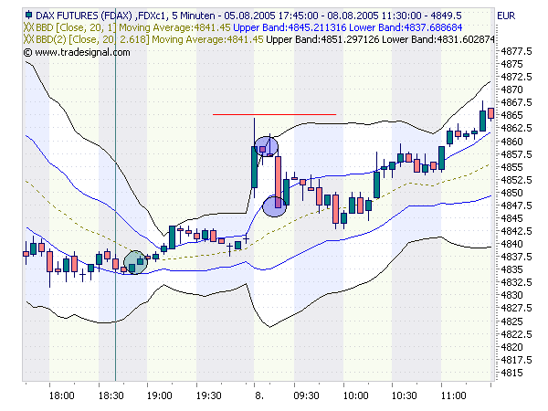 An der Signalstelle im CHart gehen die Bänder aufeinander zu; sie werden enggeführt. Damit wird das getriggerte Signal auch gültig.