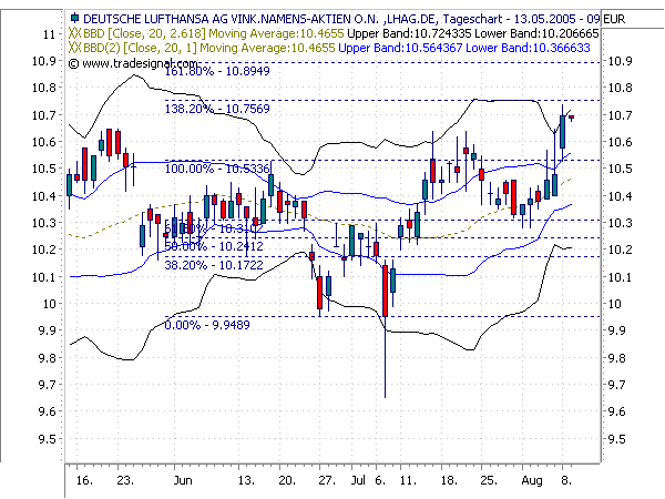Der MA-BBd hat gut gehalten. Die BBD selbst sind etwas divergent in ihrer Ausrichtung und repräsentieren so gut, daß diese Situation eher unklar ist; die jetzige Aufwärtsbewegung könnte auch eine Korrektur der Abwärtsbewegung sein.