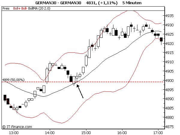 Einfach zu beobachten: egal ob es einen Ausbruch nach oben oder unten gibt, die Bänder gehen jeweils auf die gleiche Art auf.