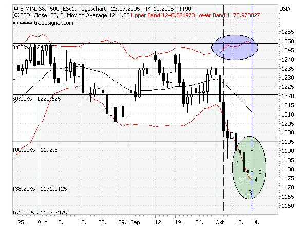 Betrachtet man das Verhalten des BBD+ während der Abwärtsbewegung sieht man deutlich das vorhandene Momentum (erste blaue Linie), das die BBD aufbiegt. An der zweiten Linie knickt das BBD+ ein und signalisiert so, daß dieser Teil der Abwärtsbewegung beendet ist. Die Kurse bewegen sich seitwärts und bilden keine neuen Tiefs. Das anschließend wieder zunehmende Momentum biegt das BBD+ erneut auf. Die gestrige weiße Kerze beendet nun diesen zweiten Teil der Bewegung. Ob sich nun eine dritte Phase anschließt, kann man natürlich nicht sagen. Hierzu nun Fibos und candles.