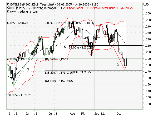 Die ausgebildete Formation betrachte ich als morning star, auch wenn kein gap vorliegt. Da sie sich an einem 138 retracement gebildet hat und BBD+ einknickt ein starkes Umkehrsignal. Wenn nun das Tief am Montag oberhalb des Freitagstiefs ist, hat sich ein 5-er Fraktal ausgebildet, was ein weiteres starkes Umkehrsignal ist.