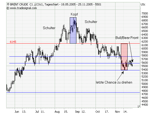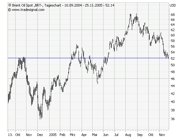 Brent ist an einer wichtigen Fibolinie angelangt. Schön zu sehen, wie diese auf das Hoch Oktober 2004 paßt. Habe mal im Traders gelesen, daß horizontale Widerstände/ Unterstützungen in Commodities relativ wichtig sind. Vor dem Hintergrund, daß sich commercials an bestimmten Marken absichern durchaus plausibel. Werde auch hier am Montag einen papertrade starten.