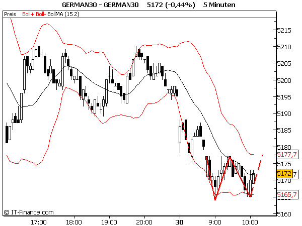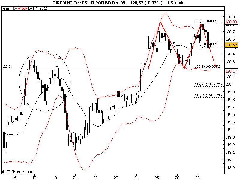 Grundsätzlich verwende ich die BBD als Filter, um den derzeitigen Marktzustand auf einen Blick einschätzen zu können: Trend- oder Seitwärtsphase, wo steht der Kurs relativ, an einem Widerstand oder mit Platz? Hierzu muß man sich überlegen, wann die einzelnen Bänder Widerstände darstellen und wann nicht. Berücksichtigen, daß die Bänder den Raum umfassen, den 95% der Kurse nicht verlassen.