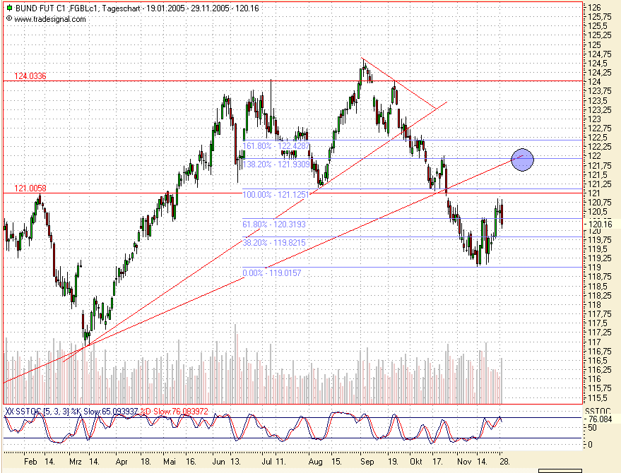 Wie der Name schon sagt, ist der PP der Dreh- und Angelpunkt, weshalb es verständlich ist, wenn hier eine kleine Atempause einsetzt. In dem Original Bund Chart sieht die Kerze absolut nicht wie ein doji aus, das stimmt. Im CMC schon eher, war trotzdem nachlässig formuliert. Wollte die Unentschlossenheit im Markt an dieser Stelle ausdrücken. Was zurück zum obigen Punkt führt: Wie die Wahrscheinlichkeit beurteilen, daß die Bewegung weitergeht? Anders formuliert, wie beurteile ich den Reifegrad der Bewegung?