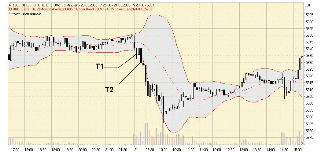 Voraussetzung ist, dass die Bollinger Bänder und der MA min. 6 Perioden flat waren. Als T0 bezeichnet er die letzte Kerze mit Close innerhalb der Bänder, darauf folgt T1 mit Close ausserhalb der Bänder, der Entry findet dann 3 Ticks über dem Hoch / unter dem Tief von T1 statt. Die Bänder sollten sich symmetrisch öffnen.