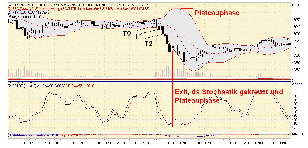 Die BBs sind mindestens 6 Perioden flat, an T1 schliesst der Kurs ausserhalb der BBs, die BBs sollten sich synchron öffnen und der Stochastik darf nicht überkauft sein (seinen Trigger von oben nach unten geschnitten haben). An T2 erfolgt der Einstieg dann 3 Ticks über T1. Normalerweise sollte T2 direkt auf T1 folgen, habe aber auf die schnelle kein besseres Beispiel gefunden.