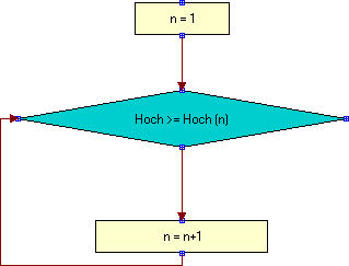 * Zunächst wird die Variable "n" vom Typ Numerisch definiert. Vor dem Eintritt des Programmflusses in die Schleife wird der Wert der Variablen auf "1" gesetzt. Beim Start der Schleifenausführung wird die aufgestellte Bedingung "Hoch >= Hoch(n)" überprüft; d.h. das Hoch des aktuellen Balkens ist größer als das Hoch von vor "n" Balken. Solange die Bedingung erfüllt ist, läuft der Programmfluss nach unten weiter und es wird der Ausdruck "n=n+1" ausgeführt, womit "n" bei jeder Auswertung der Bedingung um den Wert "1" inkrementiert wird. Wenn das Hoch von vor "n" Balken größer ist, als das Hoch des aktuellen Balkens (d.h., wenn die aufgestellte Bedingung falsch ist), verläßt der Programmfluss die Schleife am rechten Eckpunkt. In diesem Moment entspricht der Wert von "n" der Anzahl von Balken, die das Hoch zurückliegt, das größer als das aktuelle ist.