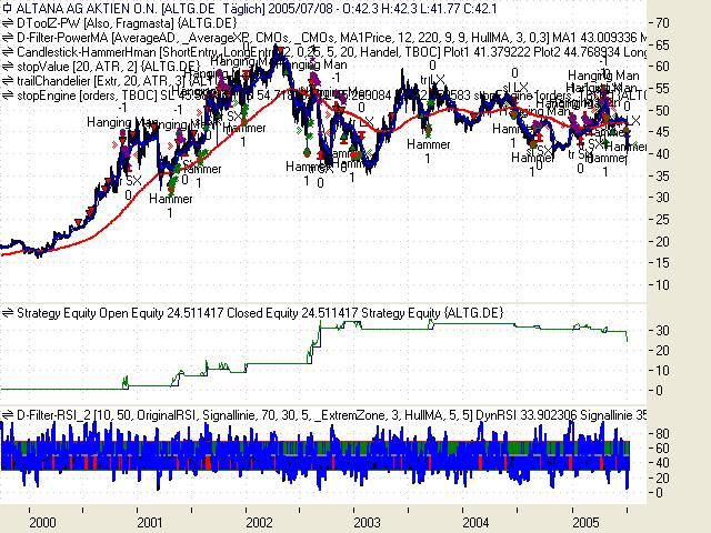 Einige Testläufe mit zwei Filtern zeigen, dass die Marktbedingungen in denen Hammer Muster profitabel sind durchaus andere Eigenschaften haben, als Marktbedingungen in denen Hanging Man Muster profitabel sind. Die folgenden beiden Bilder zeigen, das im Beispiel Altana nahezu jeder Hammer als profitables Signal gewertet werden kann, während von den Hanging Man Mustern zahlreich ausgefiltert wurden.