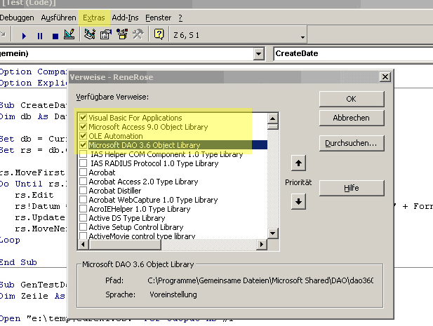 Ich kann mir eine Abfrage erstellen. Leider bekomme ich nicht raus, wie ich dieser Abfrage nun Spalten hinzufüge, die Typen der Spalten festlege und diese Spalten dann mit dem Recordset verknüpfe.