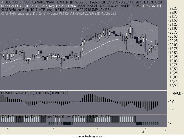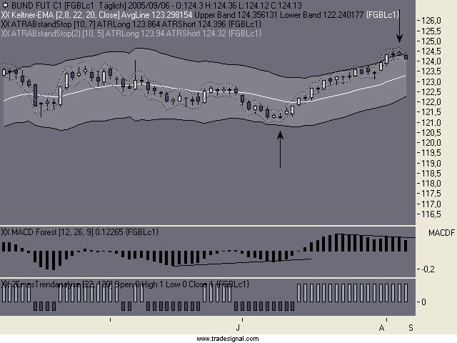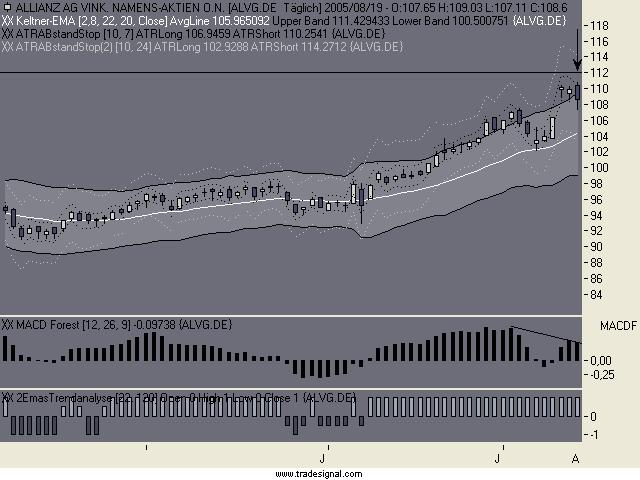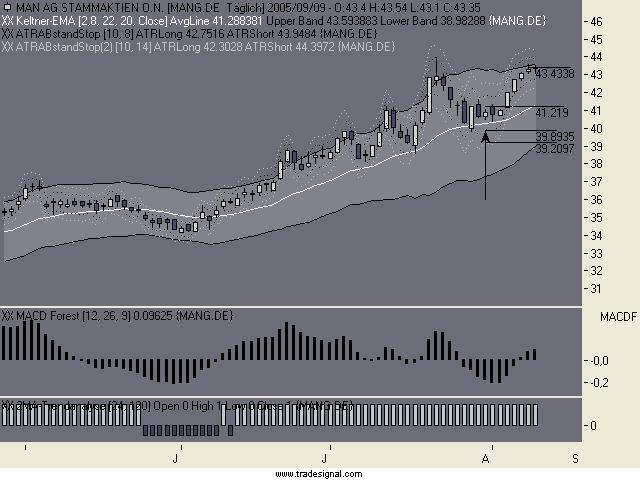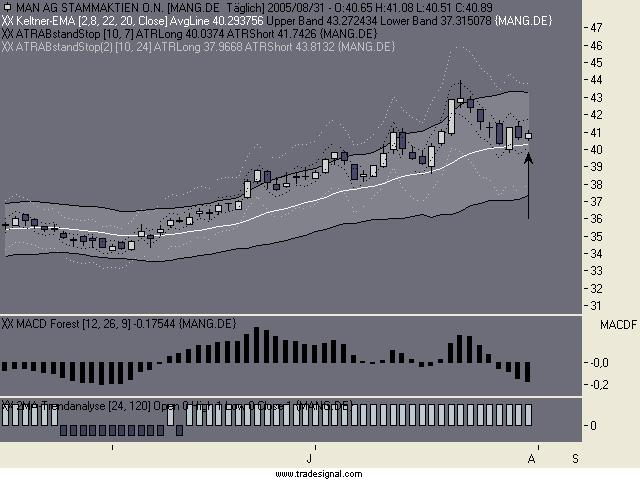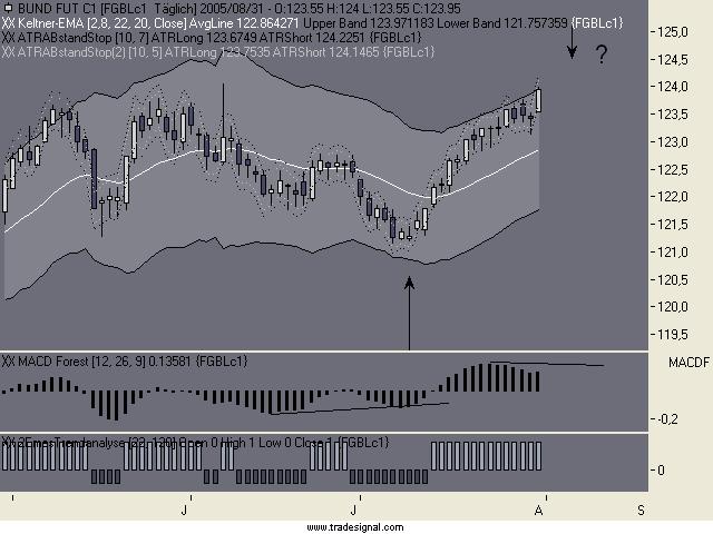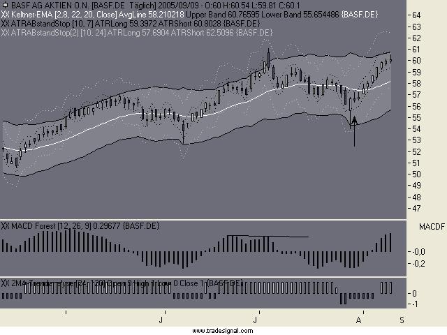 Als letzten Indikator im Tageschart habe ich mich für die Keltner-Kanäle