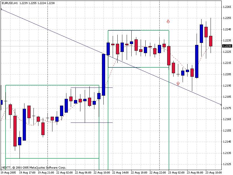 Die Box Josh ist noch bißchen falsch gerechnet (war meine erste Version), da ist noch eine Candle zu viel vorne mit drin. In meinem Screenshot würde die rote Linie gelten, allerdings muß ich mir auch nochmal genauer ansehen, weshalb die gelbe da eigentlich tiefer liegt Aber auf der anderen Seite sind 2-3 Pips Unterschied kein Beinbruch, mal rettet das vor nem Falscheinstieg, mal bringt's extra Profit. Aber ich werde natürlich versuchen, den Detektor so präzise wie möglich zu machen.