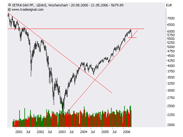 Im Wochenchart hat der DAX eine Punktlandung hingelegt. Genau auf seine Aufwärtstrendmarke aufgesetzt und gen norden gelaufen.