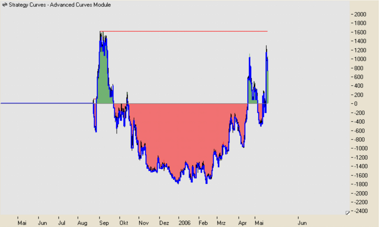 Seit dem 22.09.2005 sind wir das erste mal wieder im positiven Bereich gelandet. Sollte es das Hoch der Equtiykurve von 1.627,00 EUR übersteigen, wäre die erste Drawdown Phase vorüber. Die bis heute ca. 7 Monate gedauert hat...Mal abwarten.